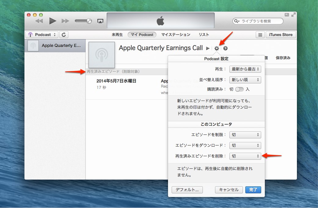 iTunes 11.2ではPodcastタブの設定UIがサウドウィンドウからポップアップタブに変更されています。