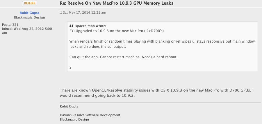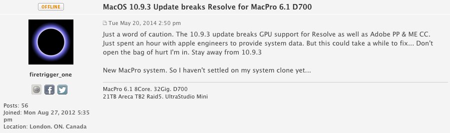 OS X 10.9.3 breaking Mac Pro graphics card compatibility with critical proapps http://t.co/4hZl1MP44N