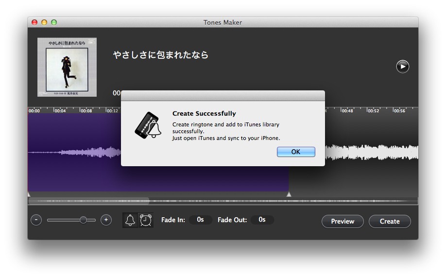 使い方はオーディオファイルをドラッグ&ドロップして、着信音用の40秒か新着メールなどのサウンド用5秒を選択、後は[Create]ボタンを押すだけでiTunesへエクスポートされます。
