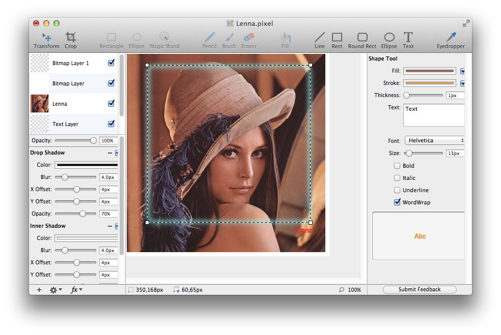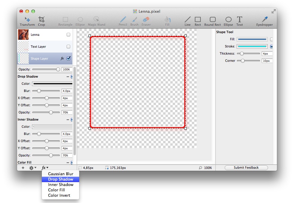 また、各レイヤー別に「Gaussian Blur」「Drop Shadow」「Inner Shadow」「Color Fill」「Color Invert」のエフェクトもかけられます。