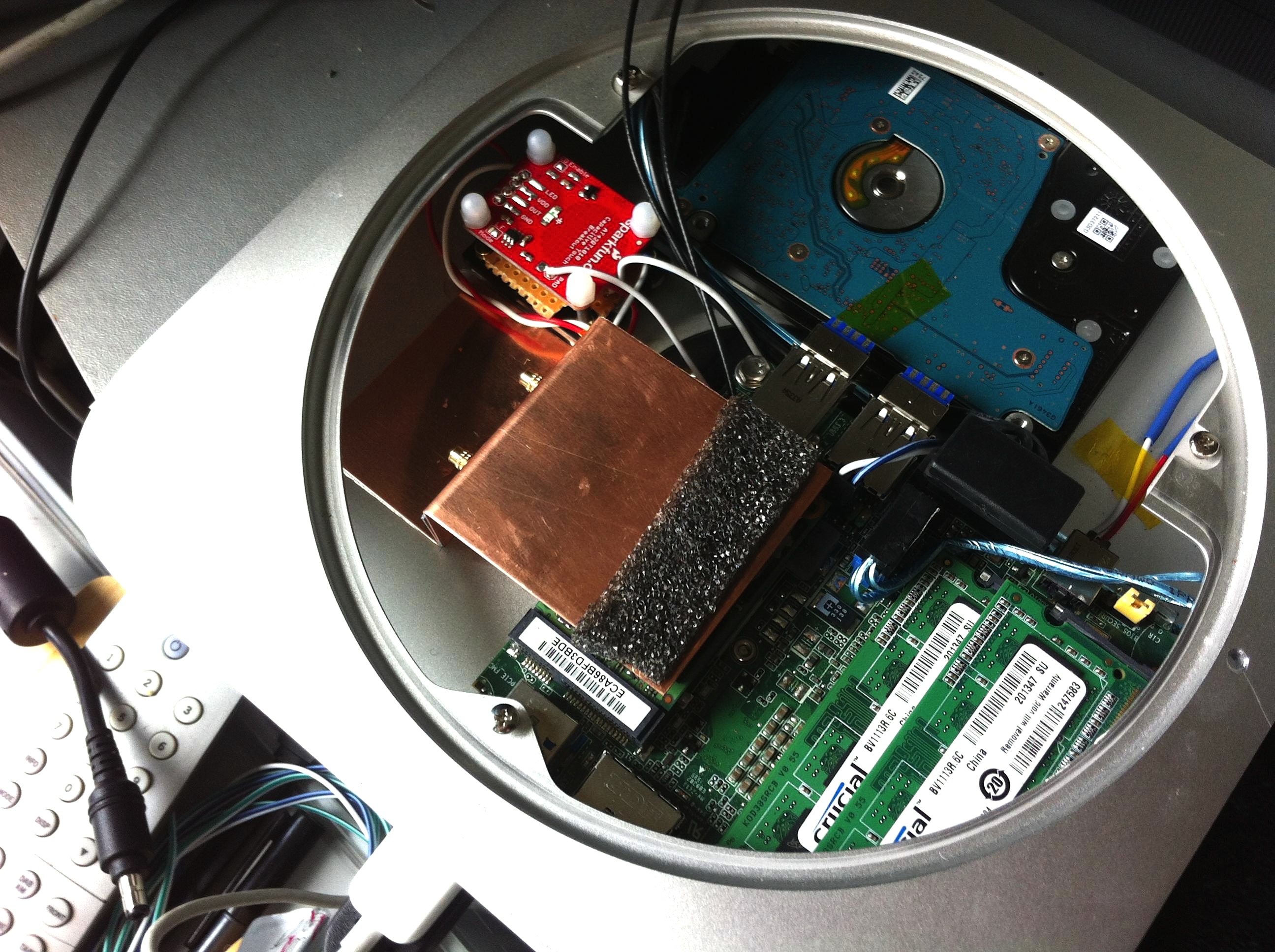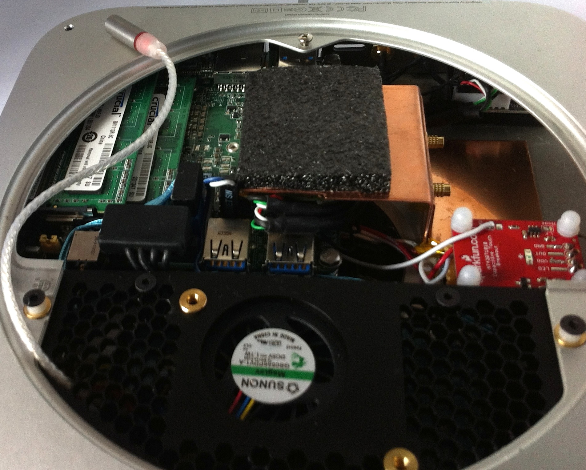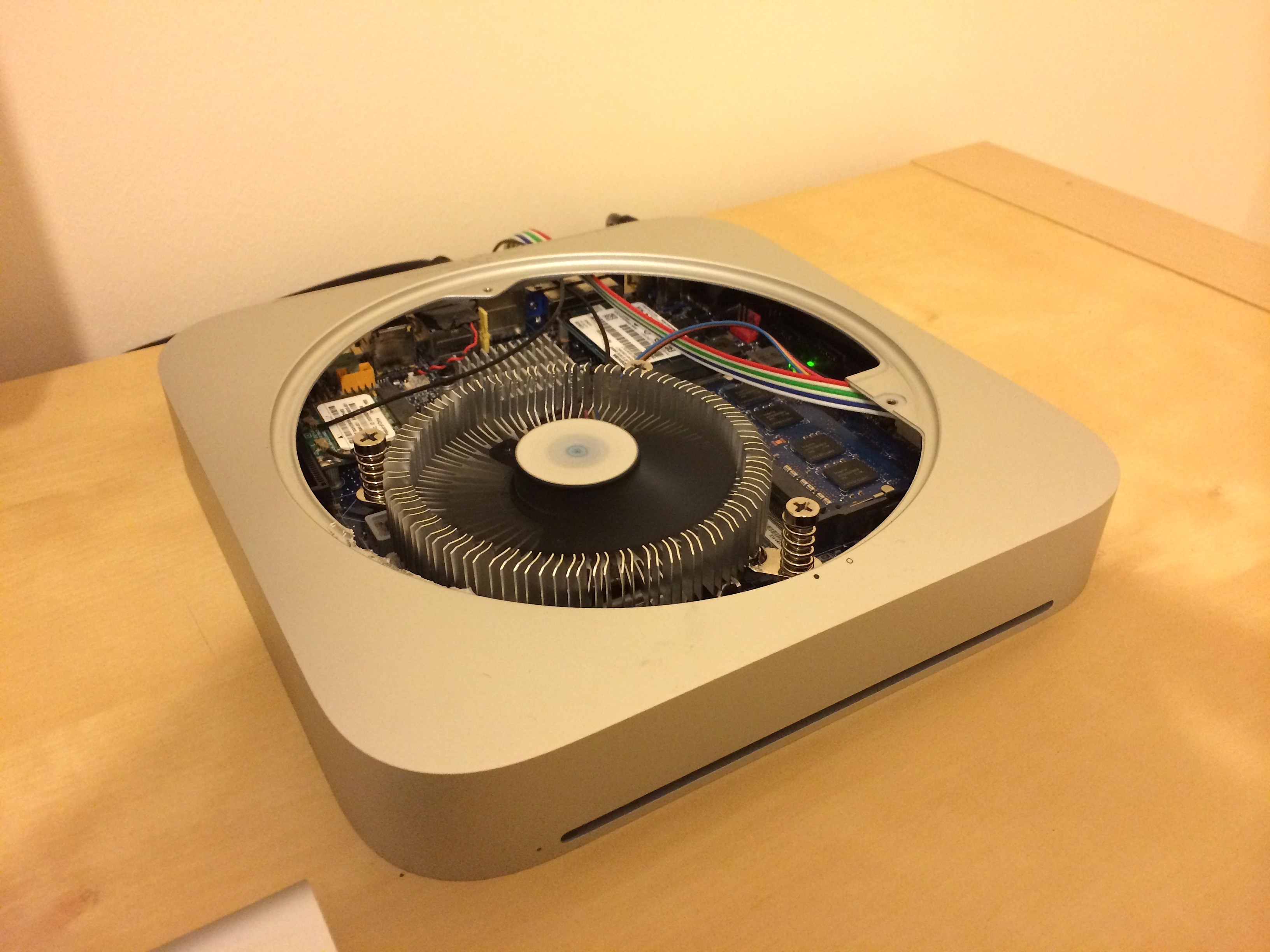 などをMac mini Mid 2010の筐体内に無理やり入れ、CPUクラーのヒートシンク(23mm)がどうしても収まらないので角(Mac miniのcorner)にネジを取り付けて浮かしているそうです。
