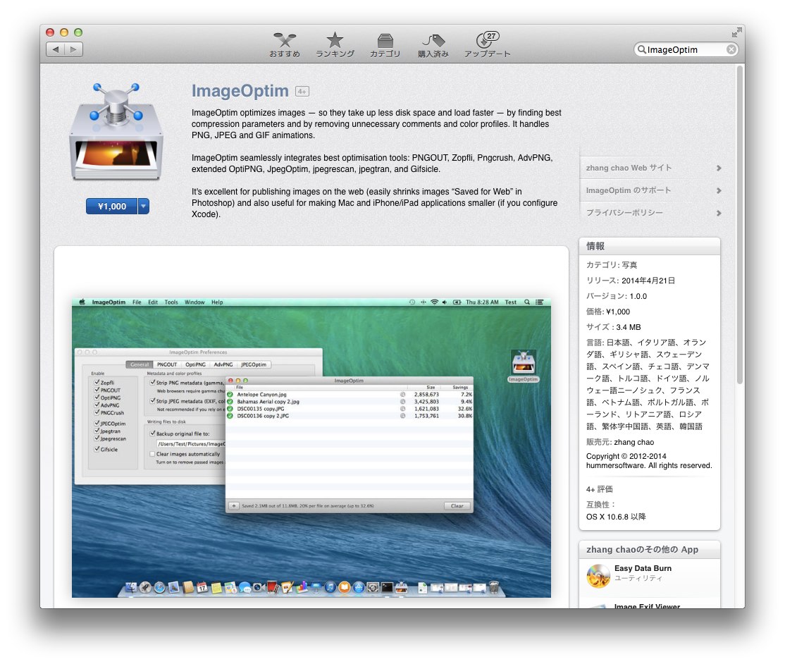 4月下旬に登場したこのアプリは1000円で販売されており、GitHubで公開しているものをそのまま使われたようで、ImageOptimの開発者であるKornelさんも公式サイトで注意を促しています。
