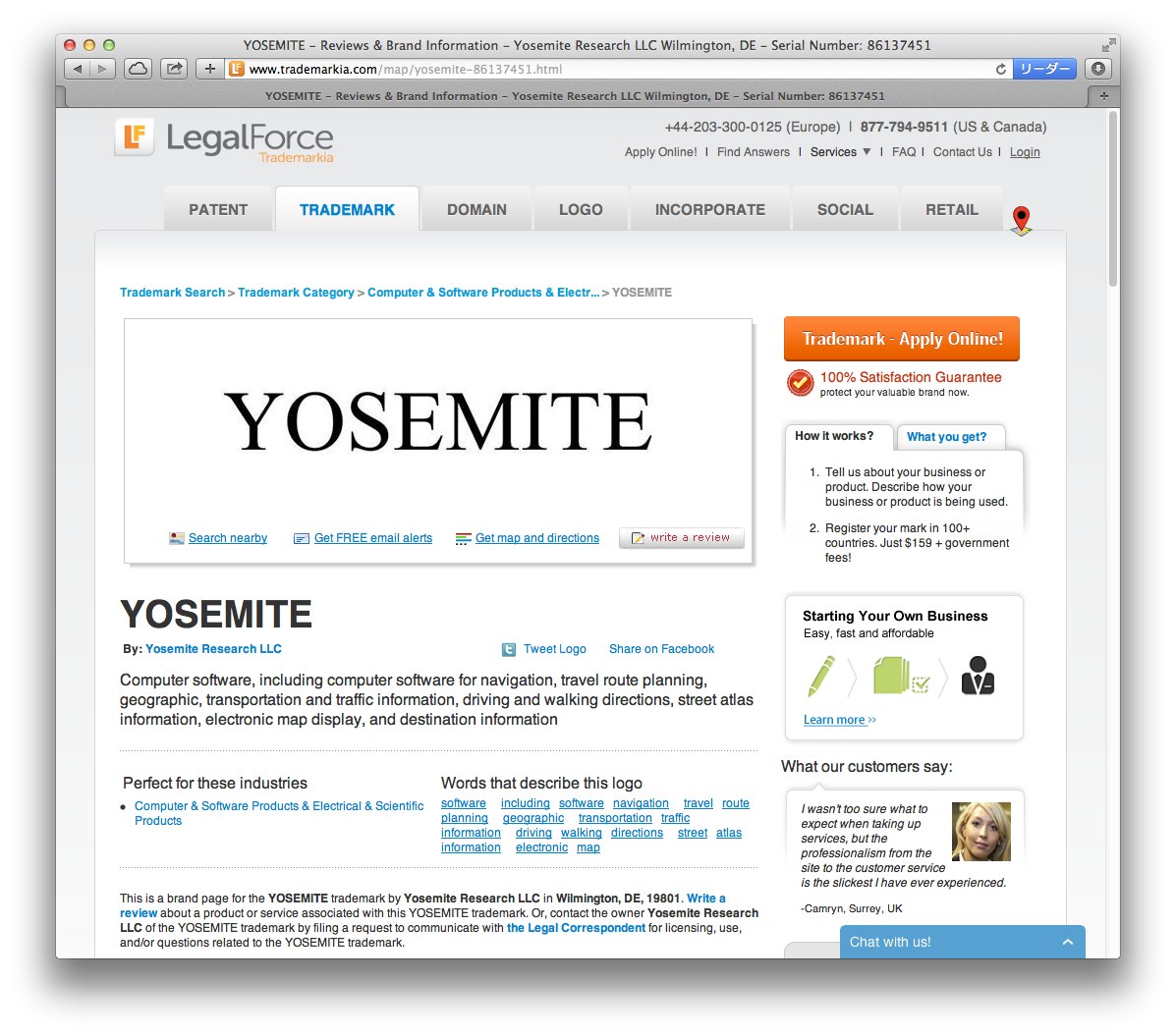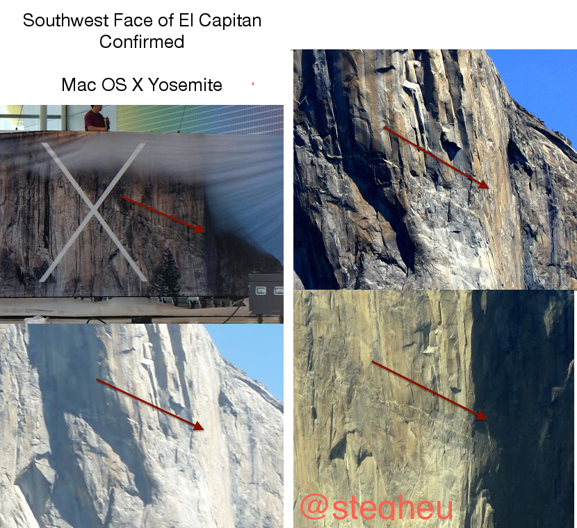 このバナーの背景はアメリカ合衆国カリフォルニア州ヨセミテ国立公園にある「El Capitan(Wikipedia:エル・キャピタン)」と思われるとのことで、Appleは既にペーパーカンパニー”Yosemite Research LLC”を通じてOS X Yosemite, OS X Redwood, OS X Mammoth, OS X California, OS X Big Sur, et OS X Pacificを商標登録しており、今回はOS X Yosemiteとなる可能性が高そうです。