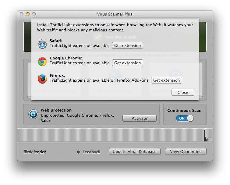 zip, rarなどの圧縮ファイルの他にpkgにも対応しており、フリー版の「Bitdefender Virus Scanner」には無いDeep System ScanとTrafficLightというブラウザ監視機能もあるようです。
