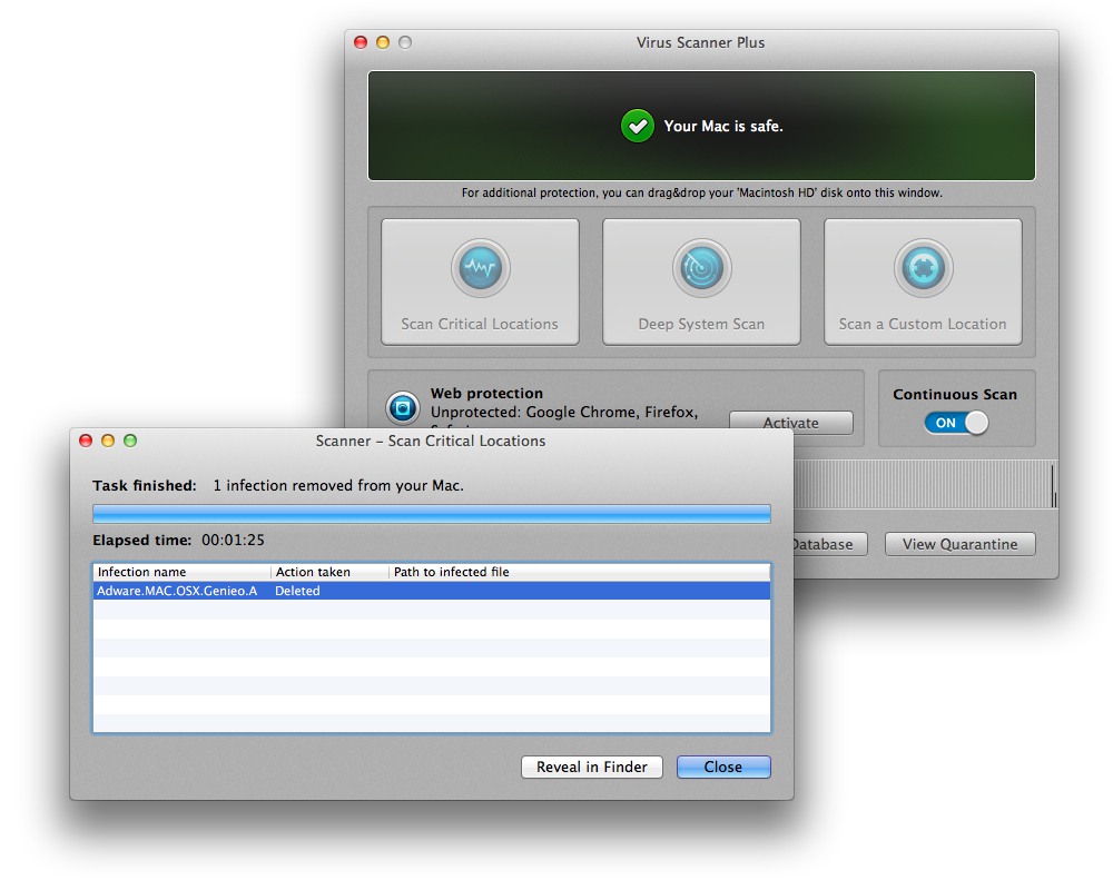 Windowsでも高評価のソフトだそうで、当然Windows&Mac両方のウィルスやマルウェア、アドウェアを検出してくれます。