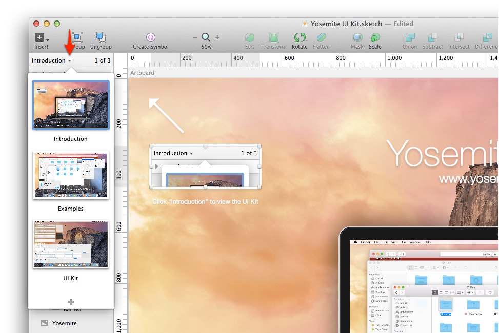 Sketch 3用で、「Introduction」「Examples」「UI Kit」の3ページに別れており、Sketch 3の新機能「Symbol」を使用して分けられています。
