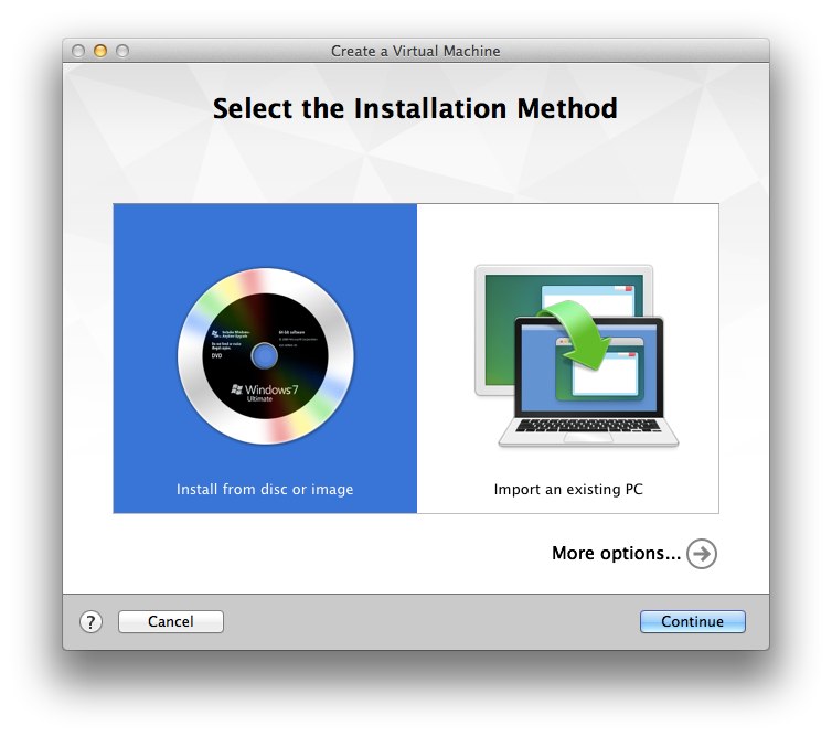 まず、VMware Fusionのメニューバー[File] > [New]から「Install from disc or image」を選択。
