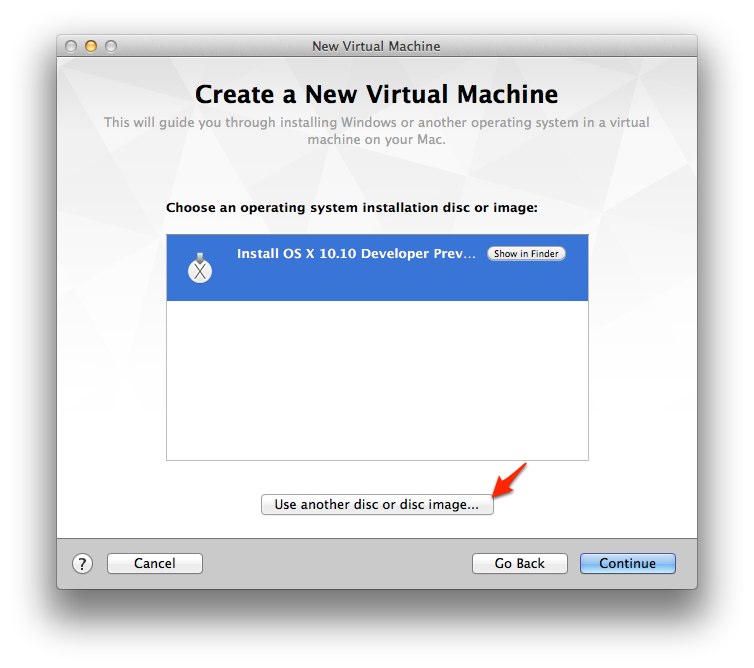 「Choose an operating system Installation disc or image」で [Use another disc or disc image …]から「Install OS X 10.10 Developer Preview.app」を選択。