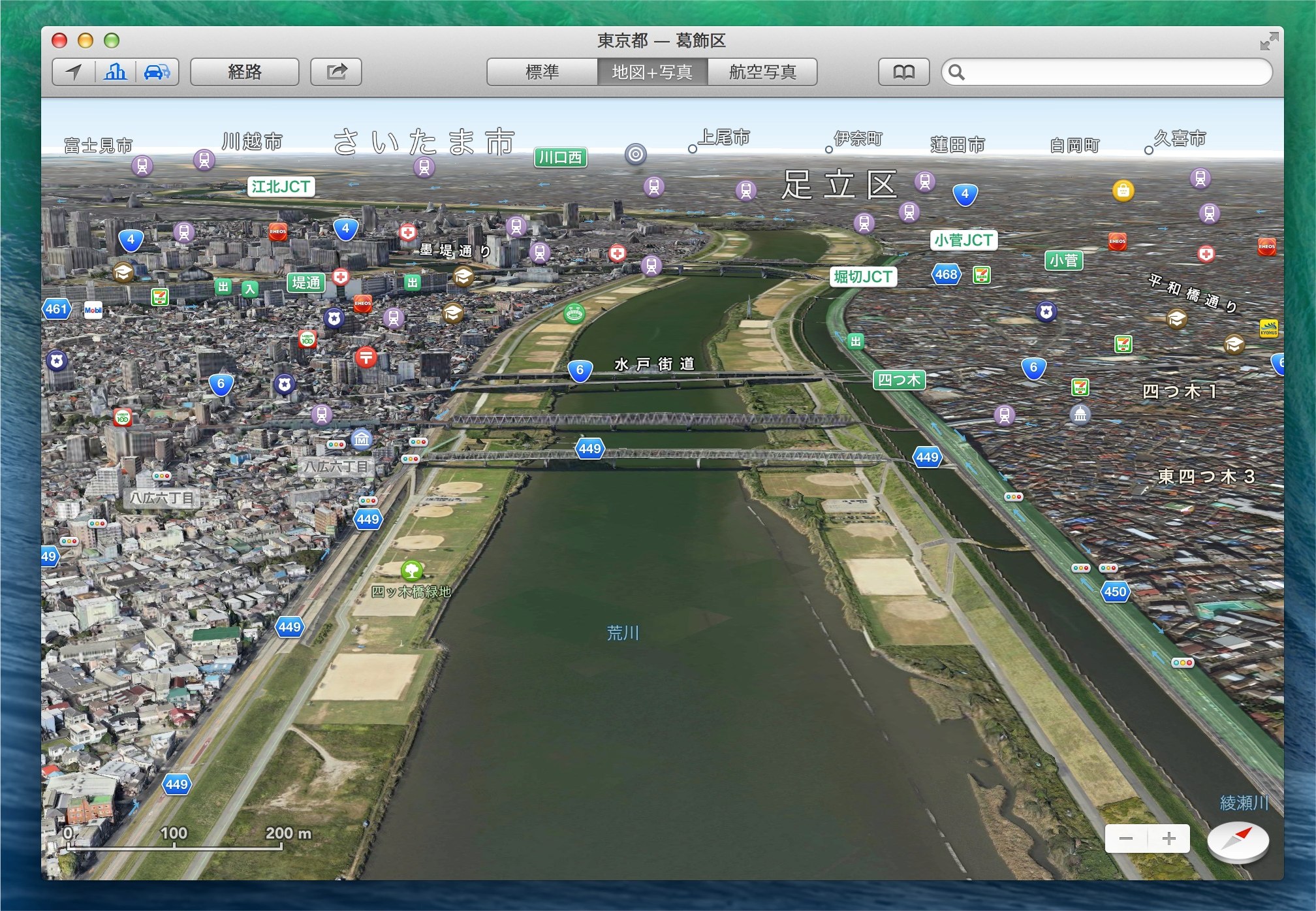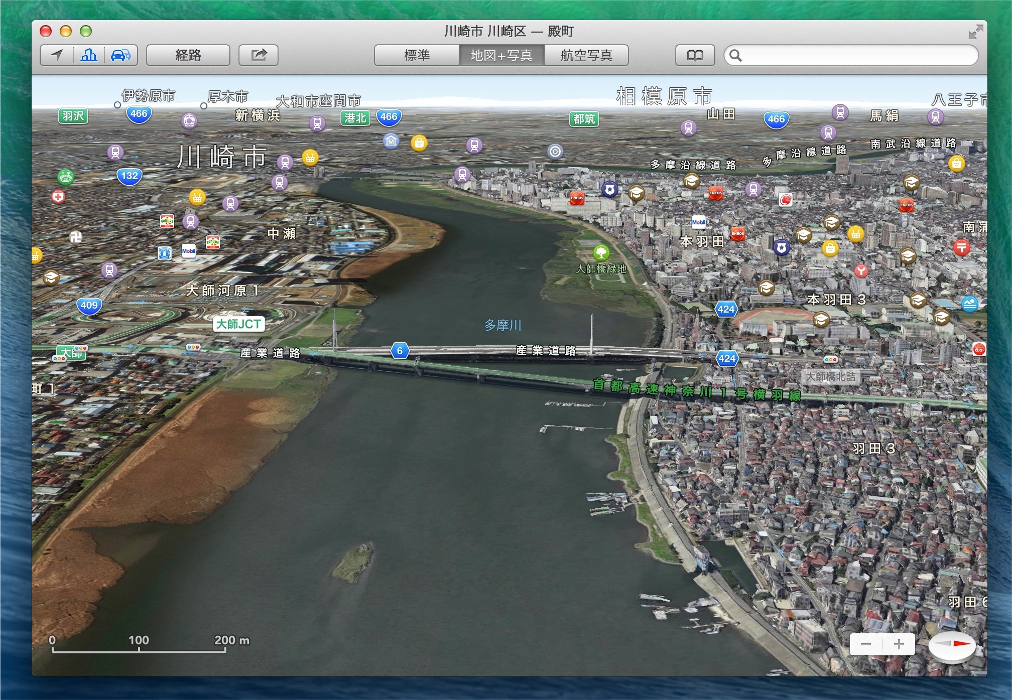 iOS 6以上の端末ならこの機能を使ったカーナビも使用可能です。また、iOS 8 (beta 2)には「Flyover City Tour」という機能が用意されており、これは特定の建設物を個別にデータを取りレンダリングし、Flyover Vivewが可能にしているようです。