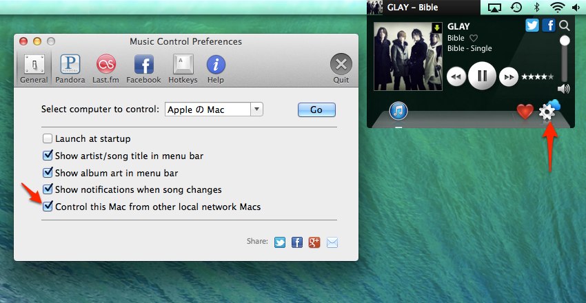 後は[Select conputoer to control]で先ほどのMacを選択すればコントロールが可能です。また、キーボードショートカットやTwitter, FacebookへのNow Playing Shareにも対応しているそうです。