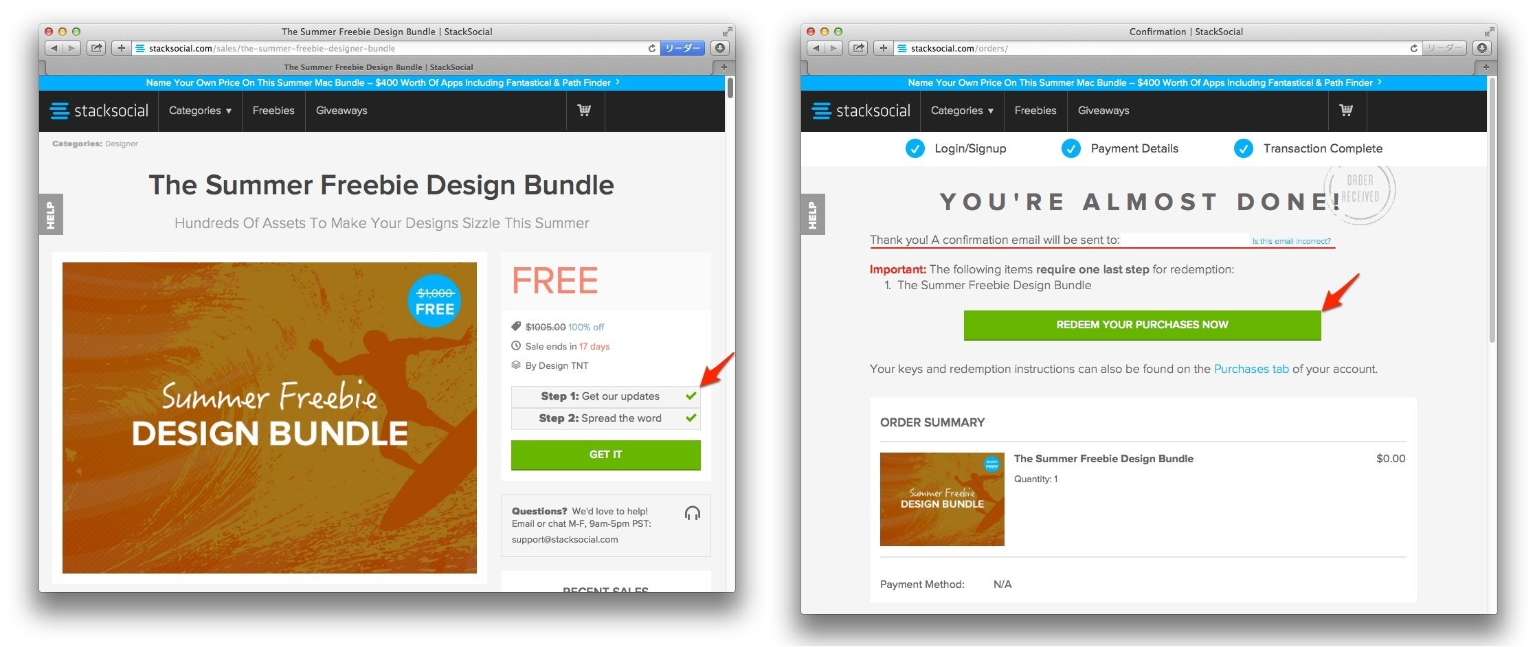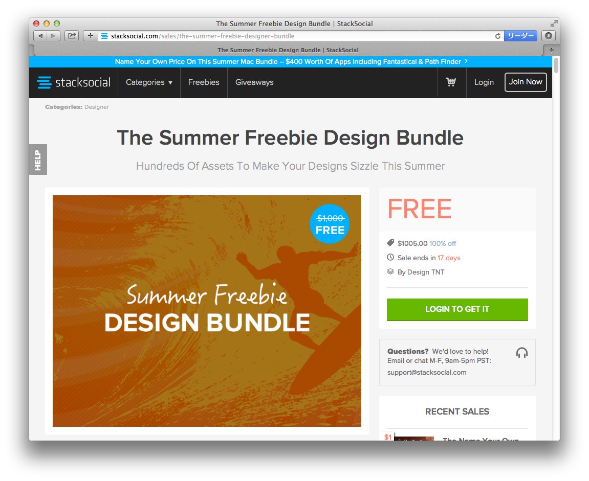 StackSocialが合計1000ドル分のPhotoshop, Illustrator, EPS素材やフォント、チュートリアルをパッケージにし無料でダウンロードできる「The Summer Freebie Design Bundle」プロモーションキャンペーンを期間限定(7月中旬まで)で実施中です。詳細は以下から。