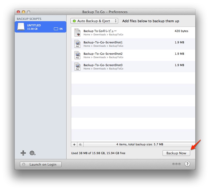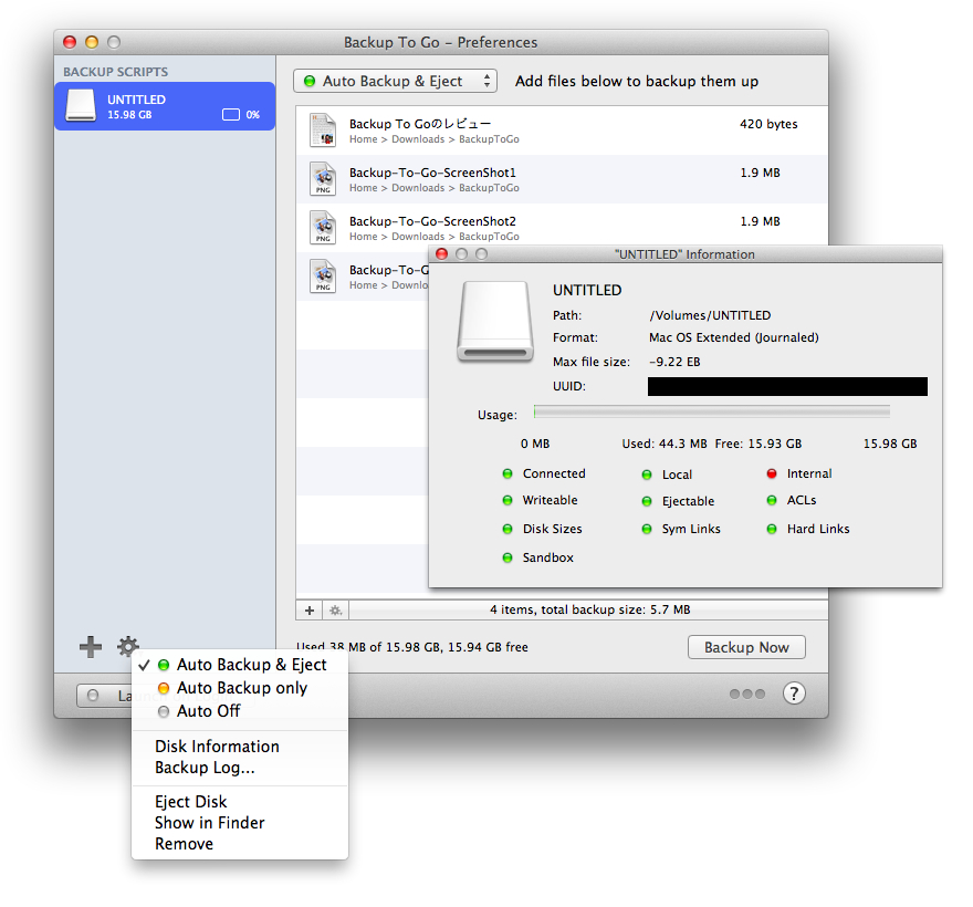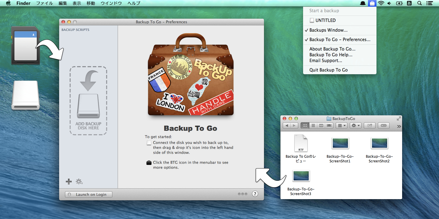 Backup To Goは「外でMacが壊れたり、盗まれたりする可能性もあるでしょ?だから重要なファイルは素早くバックアップして出かけよう!」というコンセプトを元に作られたバックアップアプリで、登録したUSBメモリやSDカード, HDDを接続すると自動的に同期しEjectしてくれます。
