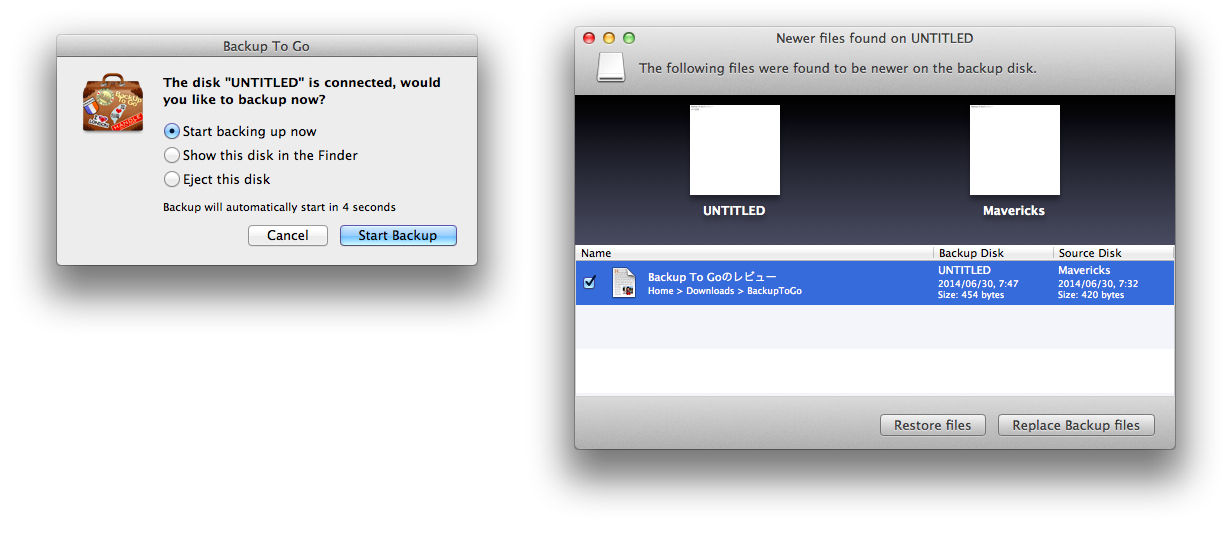 これで設定は終了で、次に登録した外付けストレージを接続するとBackup To Goが自動的に起動し「今すぐバックアップしますか?」というポップアップが現れ、10秒後に自動的にバックアップが始まります。また、外付けストレージ内に新しいファイルが見つかると比較し「Restore」か「Replace」を選択可能です。