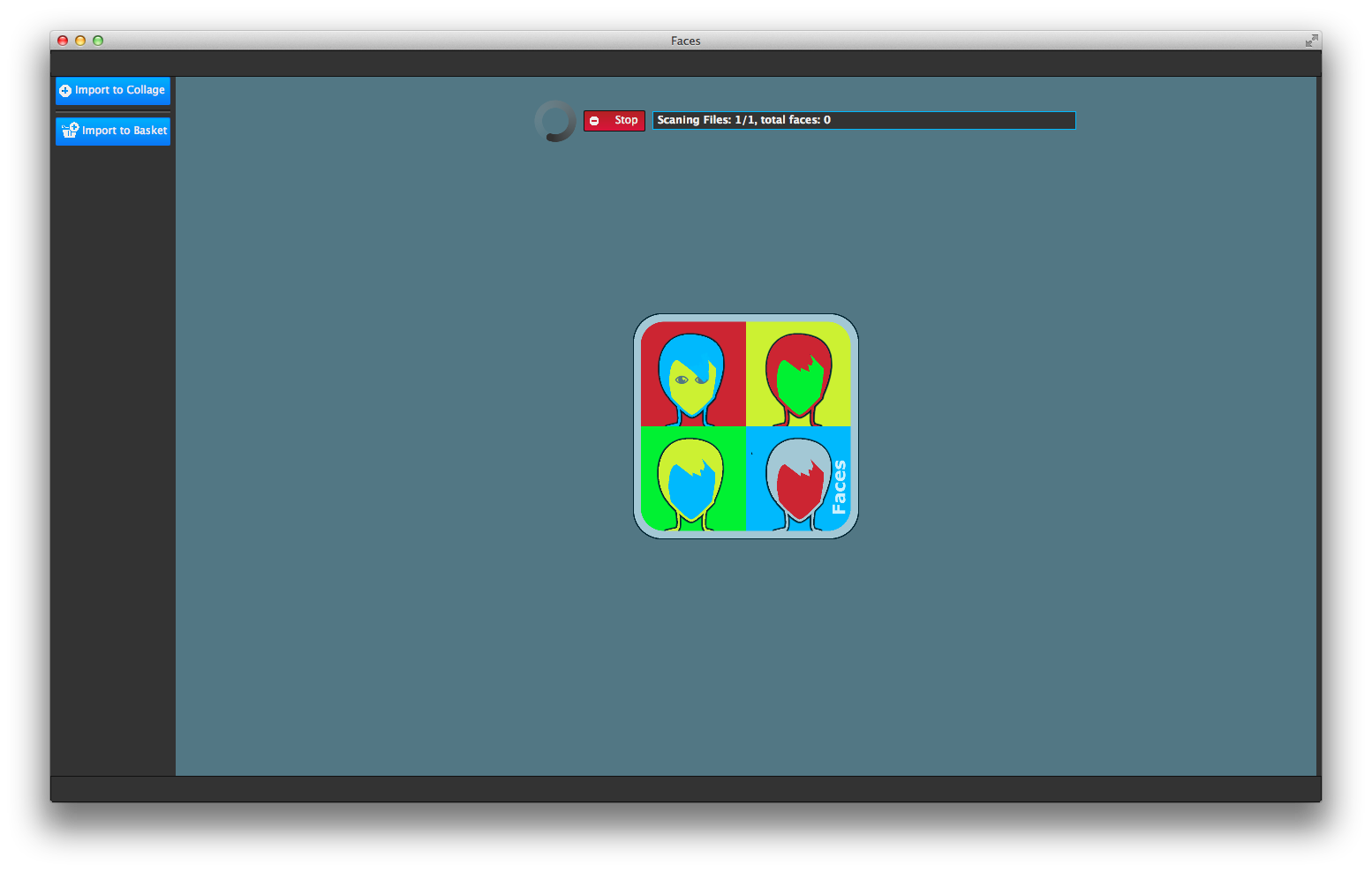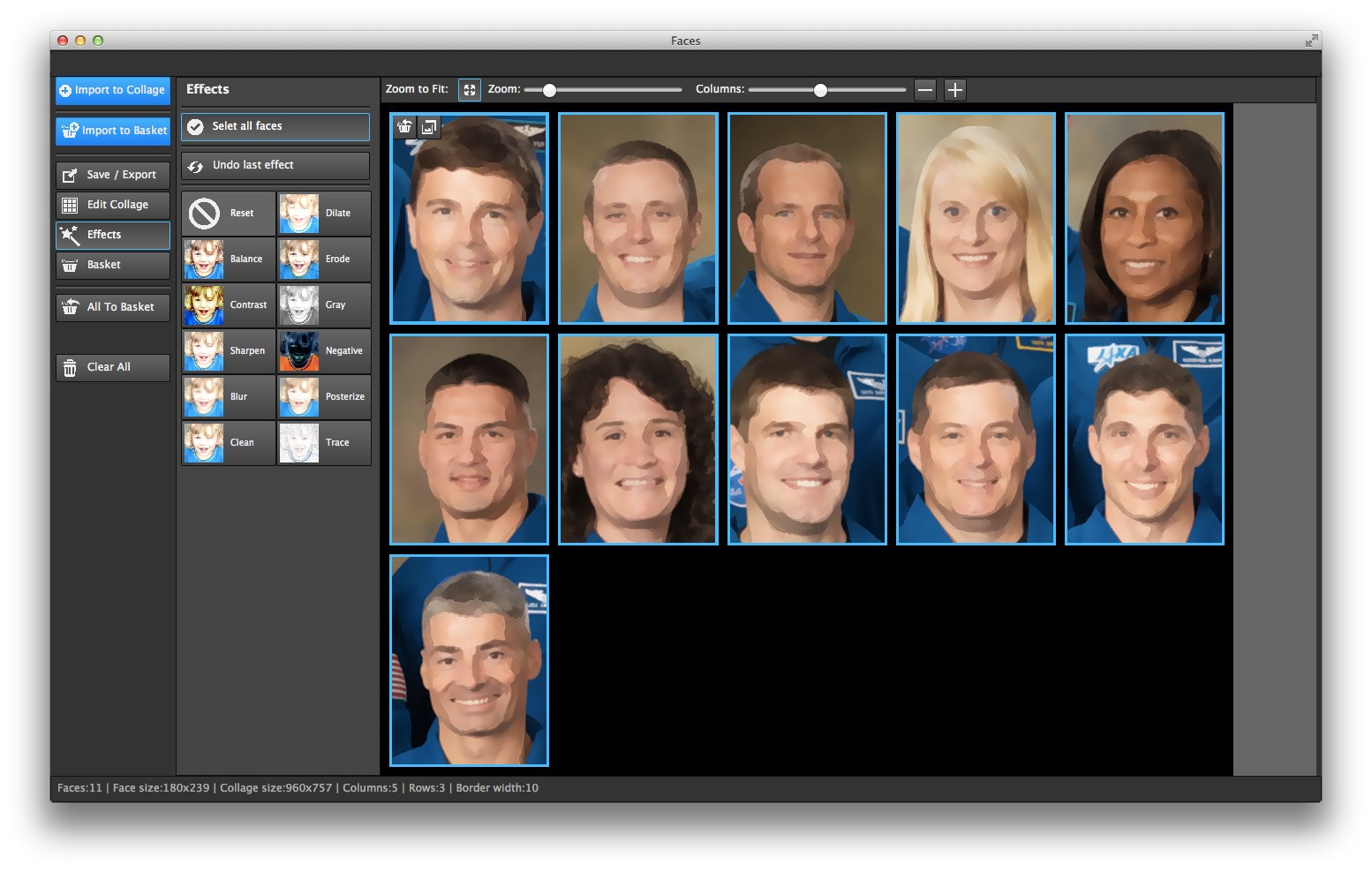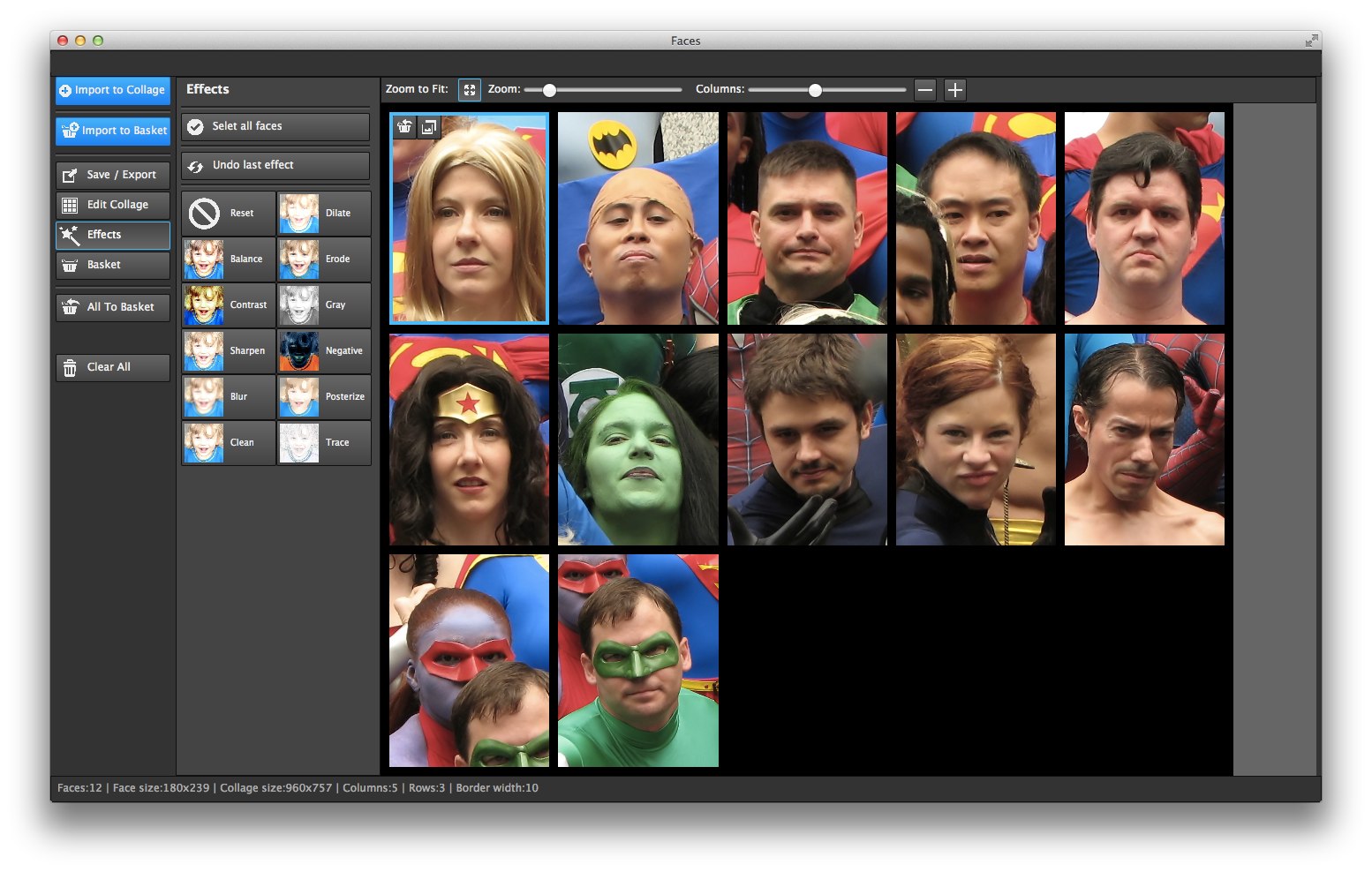 使い方は[Import to Collage]をクリックして、人の顔が写った集合写真などをインポートしてやるだけで顔を個別に抽出してくれます。