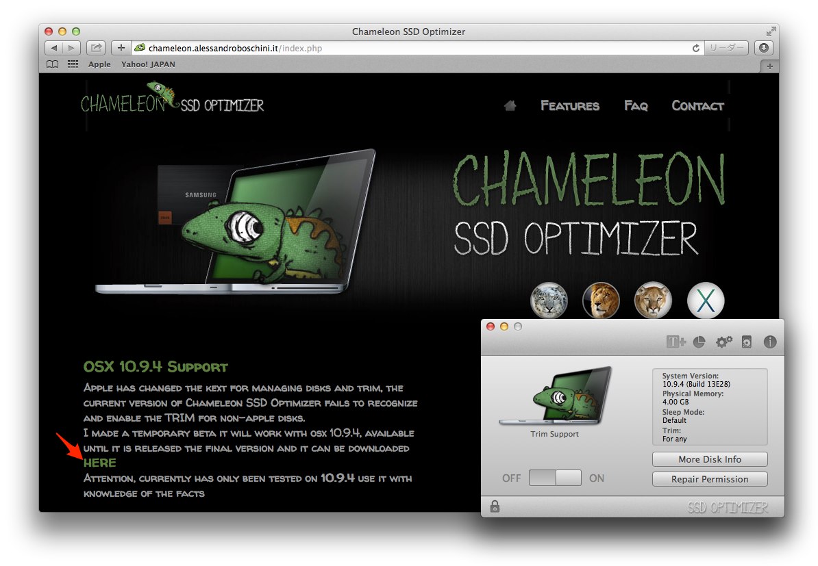 「ターミナル.appでやるのは面倒」という人は、この問題についてTrim Enablerは既に最新版で対応しており、Chameleon SSD Optimizerはbeta版を提供しているのでそちらをお使いください。
