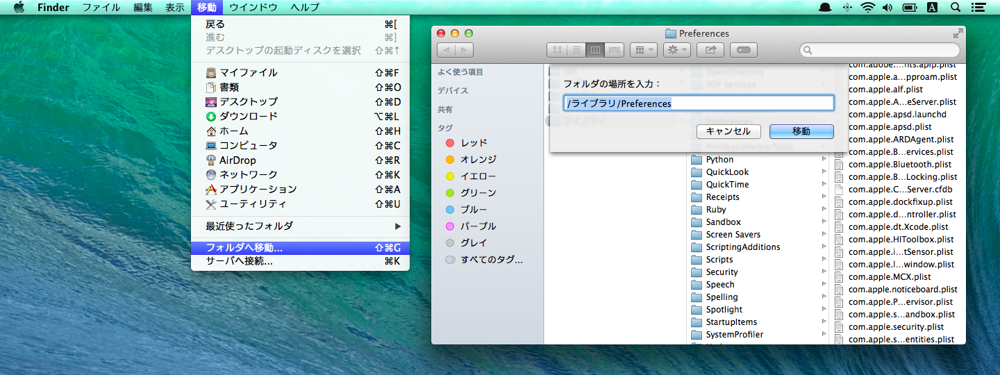 1.Finderの[フォルダへ移動]から「/Library/Preferences」へ移動。