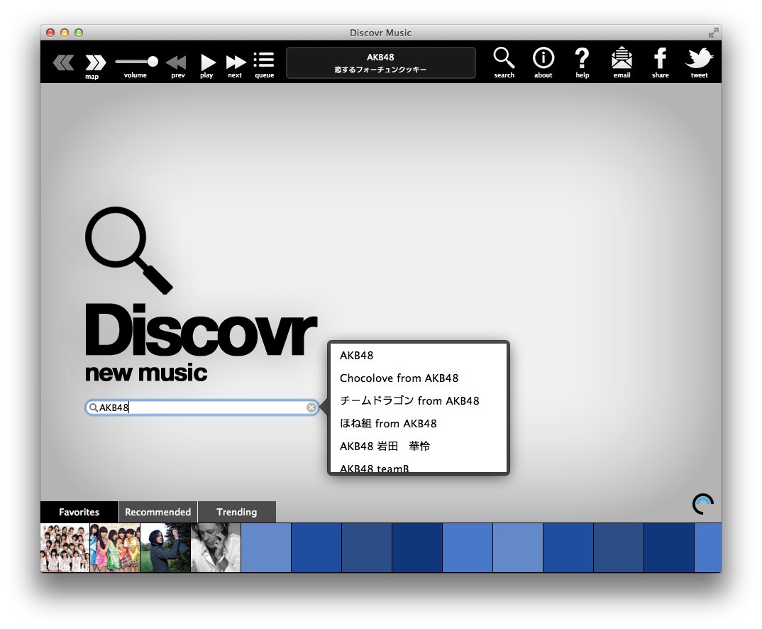 Discover Musicは世界52カ国のiTunes App Store ミュージック部門でNo1を取ったDiscover (iOS)のMac版で、検索したアーティストに関するアーティストをデータマイニングし抽出、相関図を表示してくれるアプリです。
