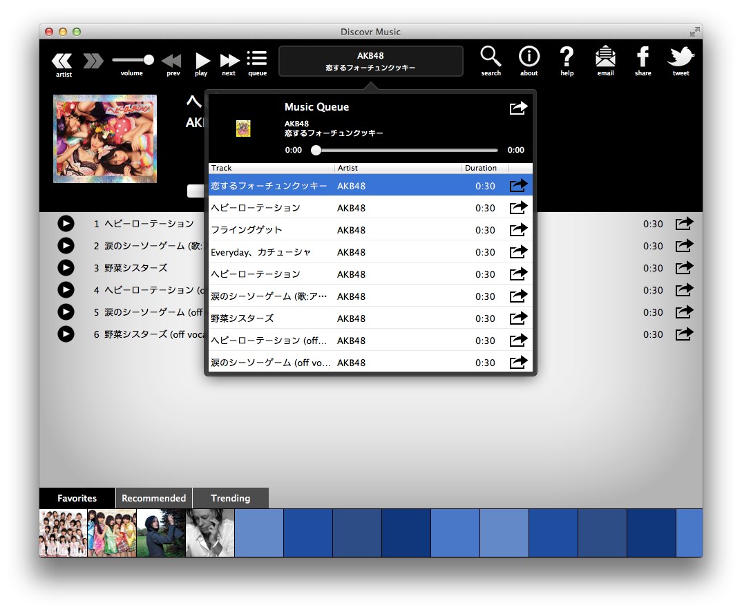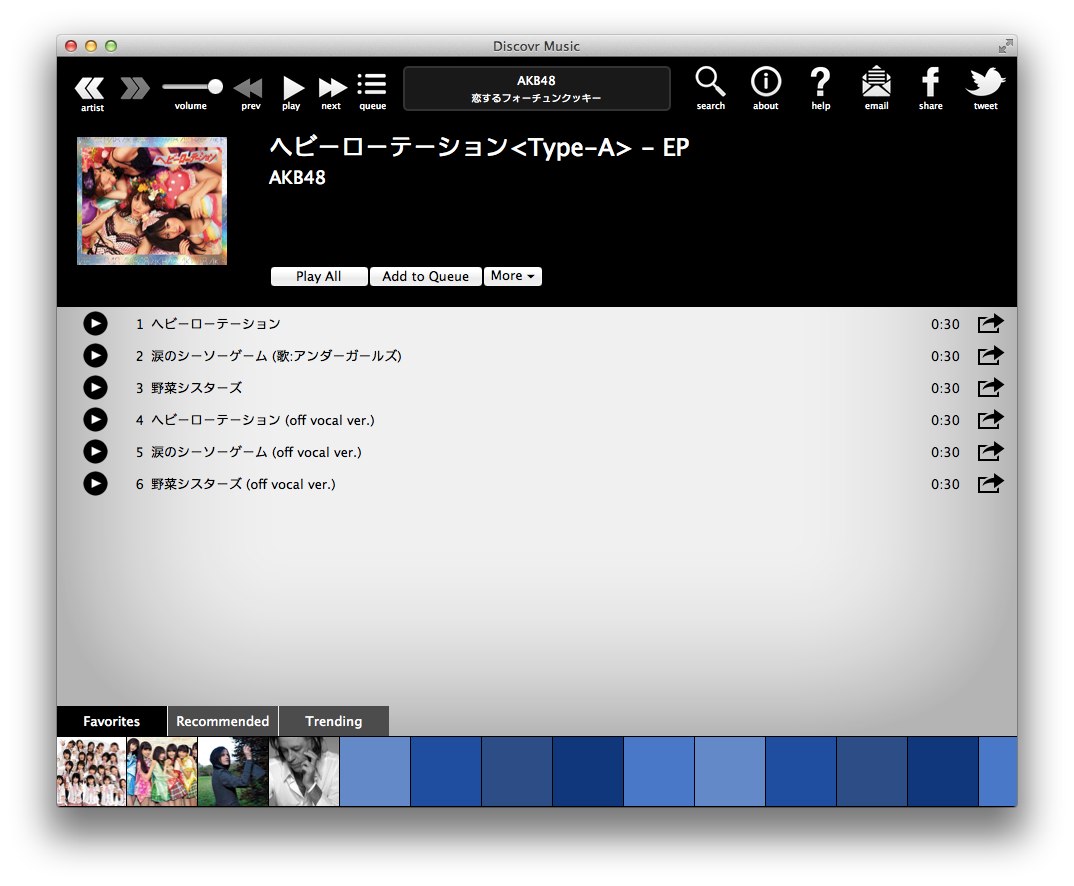 アーティストの詳細画面からAlbumsを選択するとiTunesの試聴も可能でキュー[Add to Queue]に登録しておけば連続試聴することも可能です。