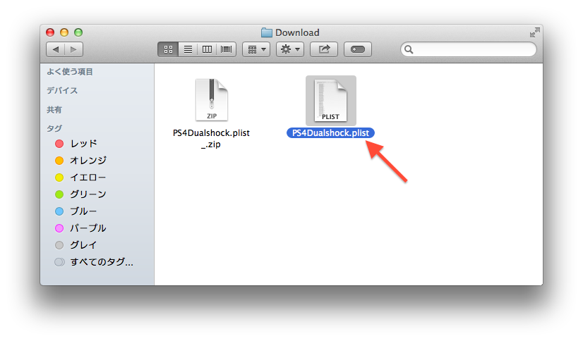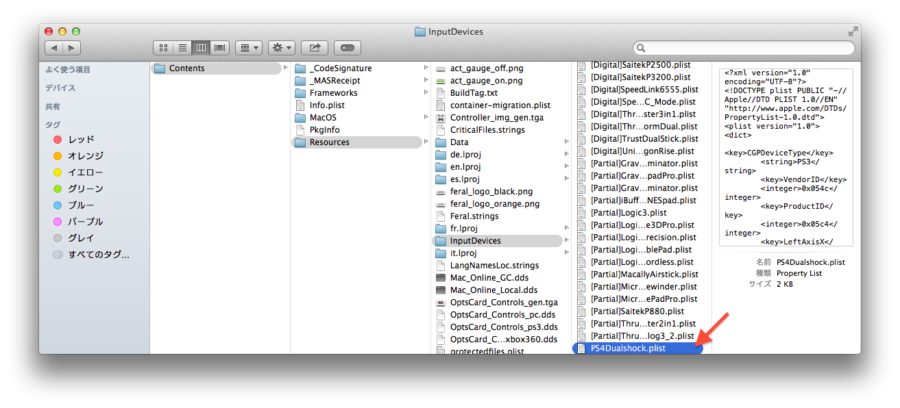 3.「hogehoge.app/Contents/Resources/InputDevices/」内に先ほどのPS4Dualshock.plistファイルを置きます(要ユーザーパスワード)。