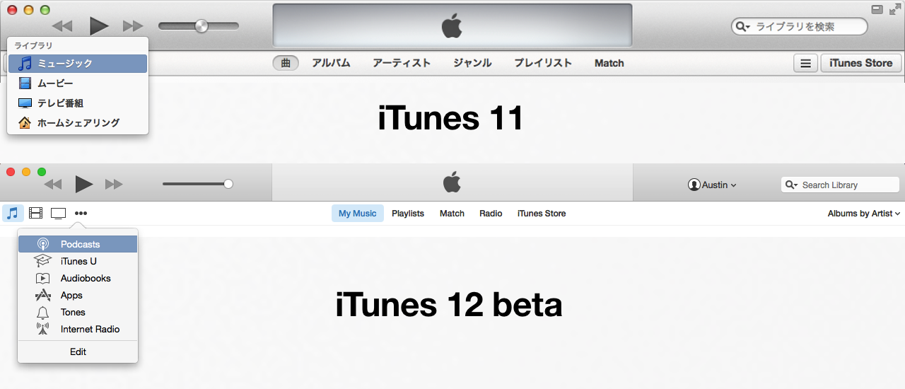iTunes 12 betaではメニューバーの再生(コントロール)ウィンドウがメニューバーと同じ高さになり、メニューバー下にあったメディア項目がプルダウン式の選択ではなくなり、複数のメディアを表示できるようになっています。