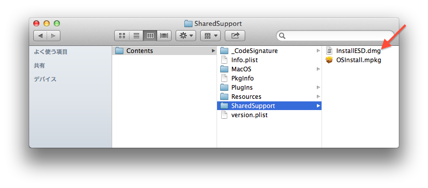 2.「Install OS X 10.10 Developer Preview.app」を右クリックし「パッケージの内容を表示」から、[Contents/SharedSupport/]に移動して「InstallESD.dmg」をコピー(ダウンロードファイルにコピーしておいてください)。