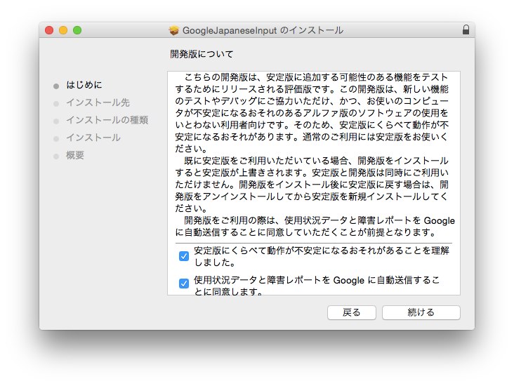 インストールは通常通り”GoogleJapaneseInput.pkg”から行えますが、このGoogle日本語入力は開発者向けにリリースされており、使用するには以下の項目への同意が必要があります。