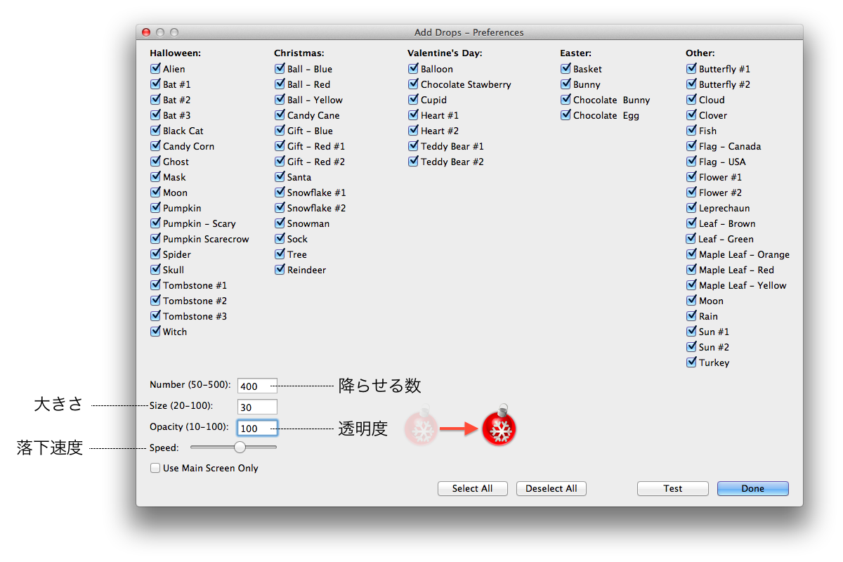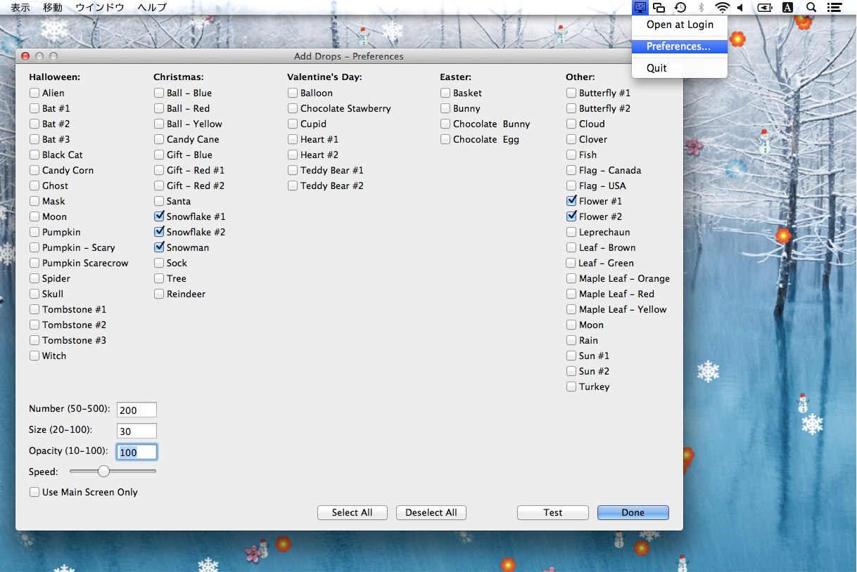 設定はメニューバーの[Preferences]からAdd Dropsの設定を起動。降らせられるオブジェクトは「ハローウィン」「クリスマス」「バレンタインデー」「イースター」「その他」の4カテゴリから選択できます。