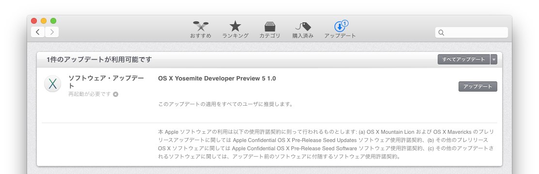 Appleが開発者向けに「OS X Yosemite Developer Preview 5 1.0」をリリースしています。詳細は以下から。