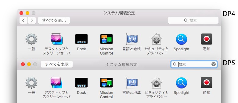 システム環境設定.appのメニューバーは検索ウィンドウ、システムボタンが同じ高さに。