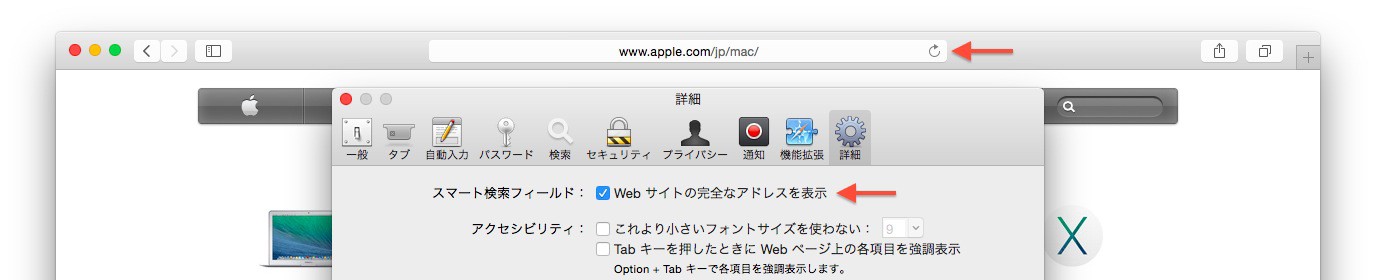 DP4までのSafari 8ではiOS 7のSafariの様にスマート検索フィールド(アドレスバー)に表示されるURLがドメインのみになっていましたが、DP5では環境設定の[詳細]項目に「Web サイトの完全なアドレスを表示」オプションが付いたようです。
