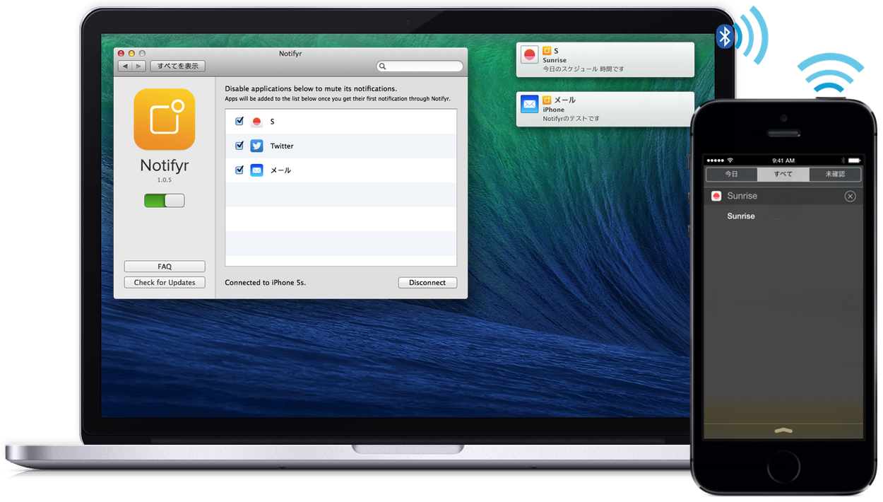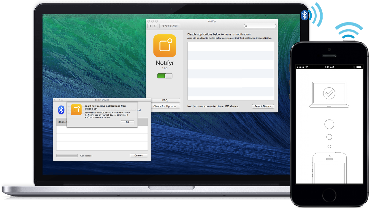 iOSの通知をBluetooth(LE)経由でMacで受け取れる「Notifyr」が無料だったので使ってみました。詳細は以下から。