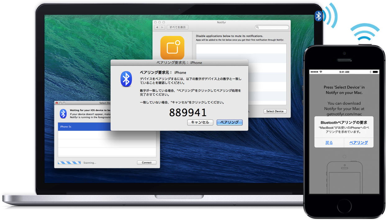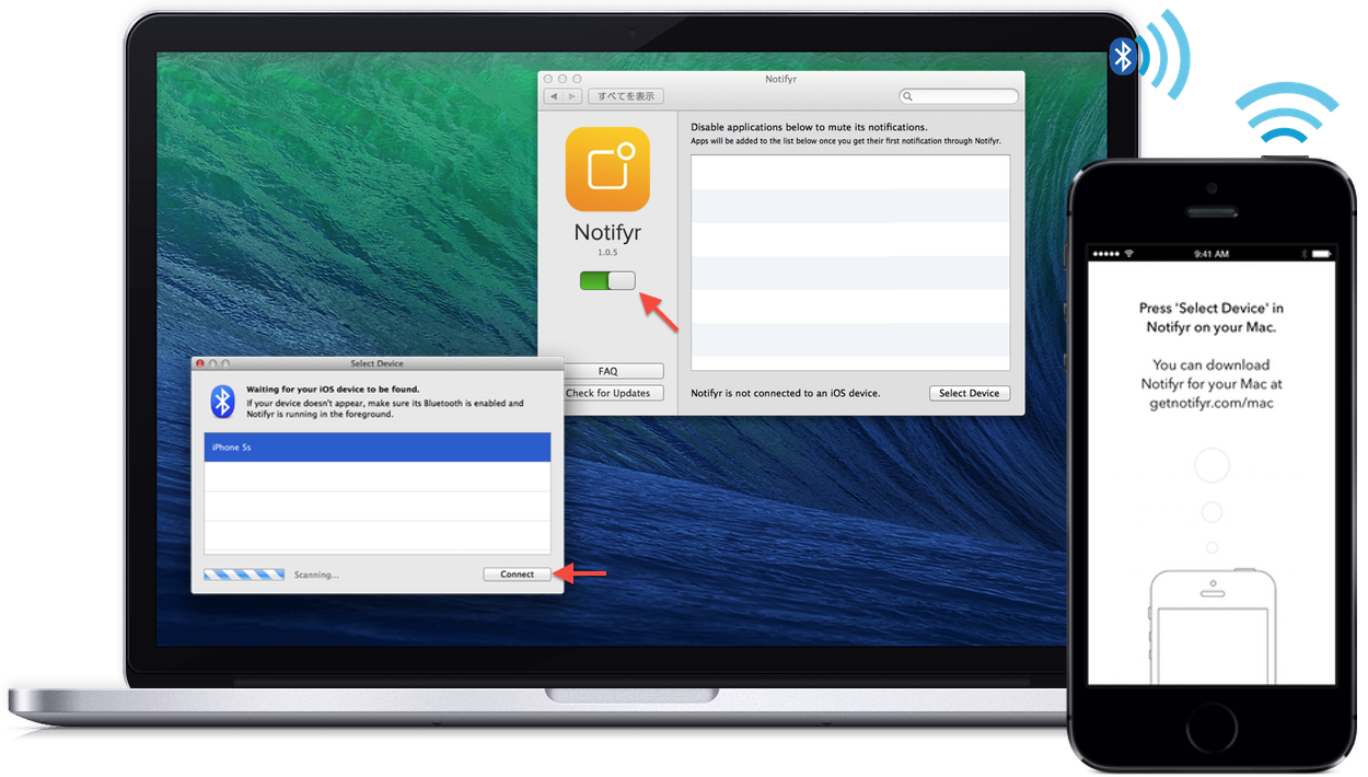 4.iOSアプリは[Start Pairing]に進み、Macの環境設定パネル「Notifyr」からNotifyrをONにし、 「Select Device」ウィンドウからペアリングしたいiOSデバイスを選択して[Connect]。