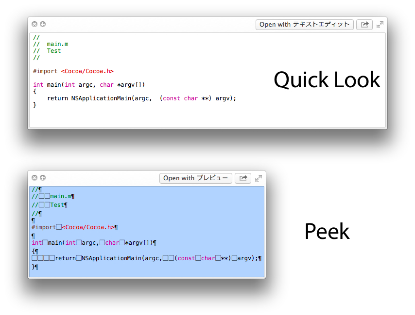 Snap Typeはメニューバーに常駐するクリップボード拡張アプリで画像やフォルダではなくテキストのみが収納され、”Quick Look”と”Peek”の2つのプレビュー表示が可能です。”Quick Look”はOS Xのものと同じですが、”Peek”は不要な書式が削除され、スペースや改行などが表示されます。