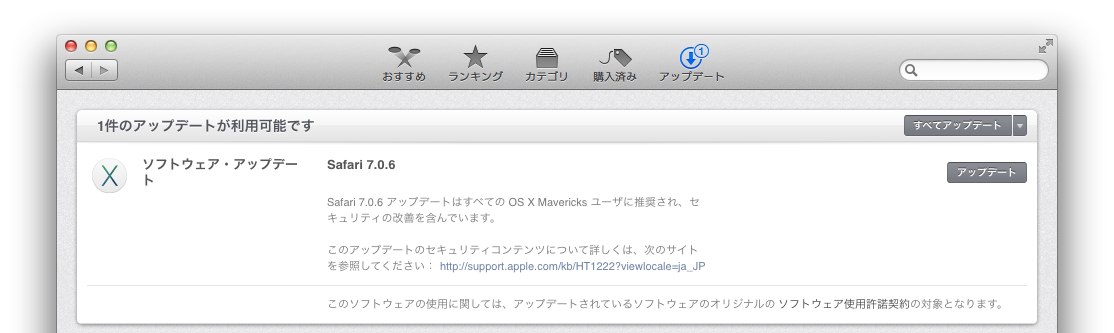 Safari 7.0.6 (for Mavericks) と Safari 6.1.6 (for Mountain Lion)では「悪意のあるサイトにアクセスした際、アプリケーションが終了されたり任意のコードが実行される脆弱性」が修正されており、すべてのMavericks & Mountain Lionユーザーに推奨しています。