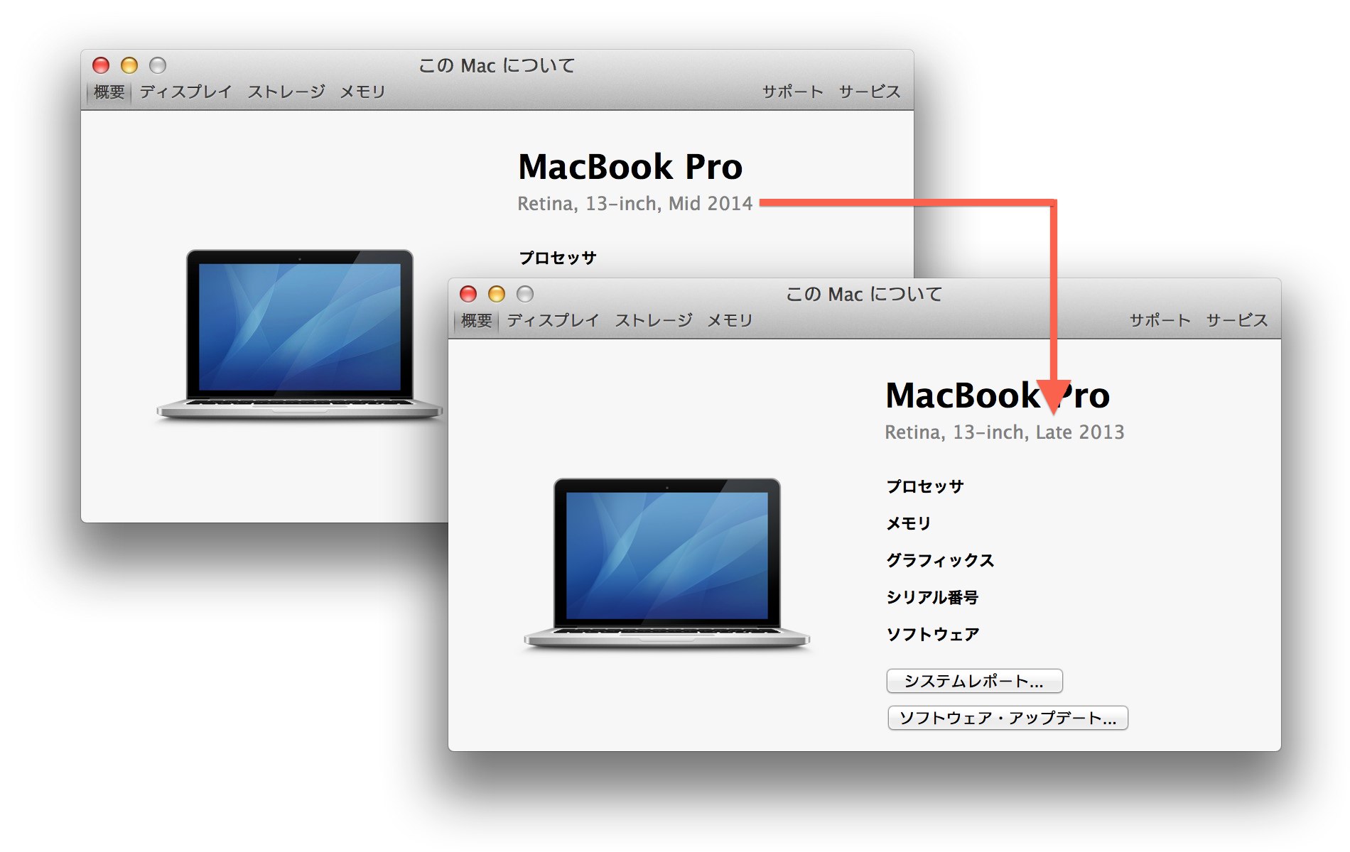 MacBook Pro (Retina, Late 2013)発生していたモデル名の誤表示がMid 2014でも発生しているようです。詳細は以下から。