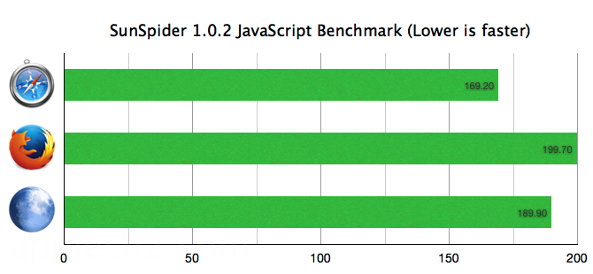 SunSpider 1.0.2 でのJavaScript Benchmarkの結果を見るとMac OS X版もWindows版と同じようにOSに最適化されているようでFirfoxより多少スコアがいいです。