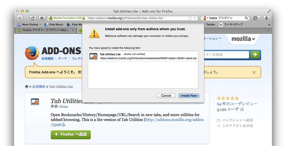 FirefoxベースなのでFirefox用のアドオンもほとんど使用可能で、Firefoxとの使い分けも可能です。