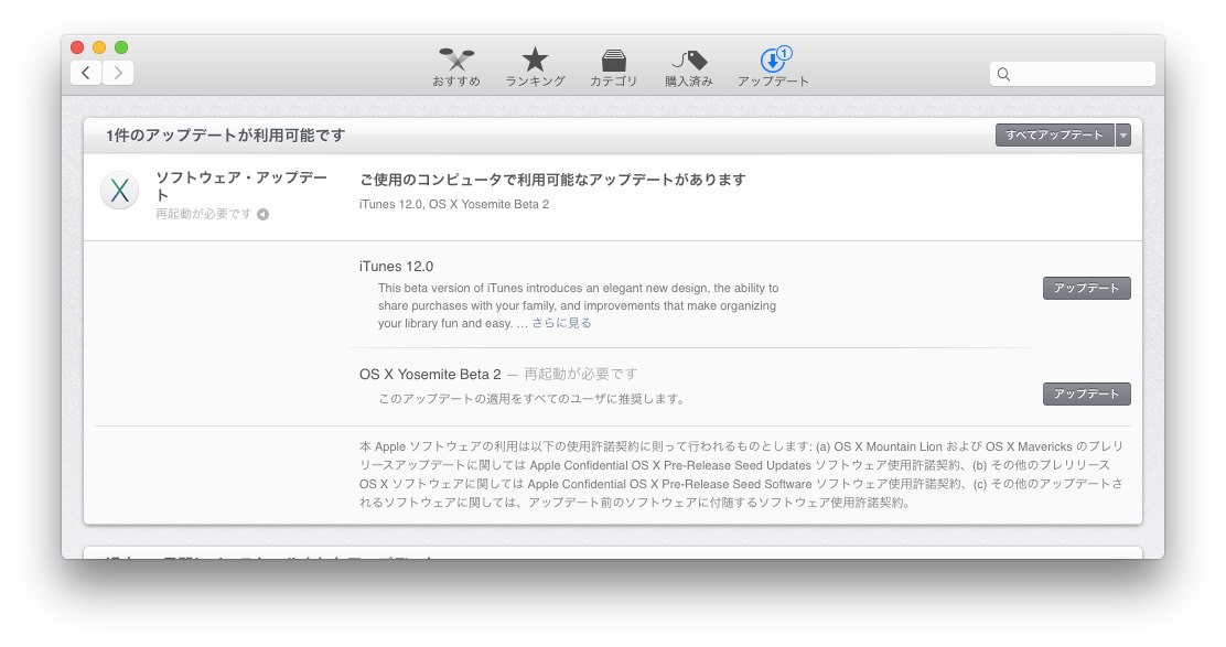 Appleは「OS X Beta Program」としてOS X YosemiteのPublic Beta版を100万名に配布していましたが、そのBeta版の初めてのアップデート「OS X Yosemite Beta 2」と「iTunes 12.0」がリリースされています。
