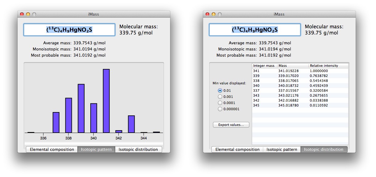 後は下のタブで「元素組成”elemental composition”」「同位体パターン”Isotopic pattern”」「同位体分布”Isotopic distribution”」などが見れ、テキストファイルへの書出しも可能です。