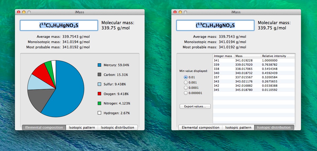iMassは入力した化学式のモル質量(分子量、平均質量、モノアイソトピック質量)や元素組成を円グラフで表示してくれるアプリです。