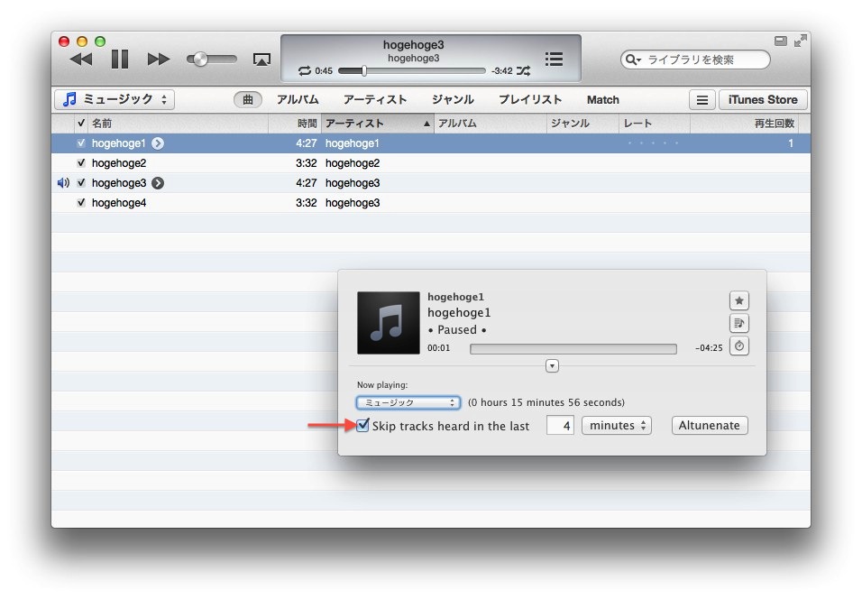 使い方は「◯◯時間内に聞いた曲をスキップ “Skip tracks head in the last in ◯◯”」にチェックを入れiTunesで曲を再生します。この状態で曲を最後まで再生するとAltunenatorがそれを記録し、Altunenator起動中で指定時間内ならばその曲をスキップしてくれます。([Altunenator]ボタンはプレイリストの再生時間から指定時間を自動的に割り出してくれます)