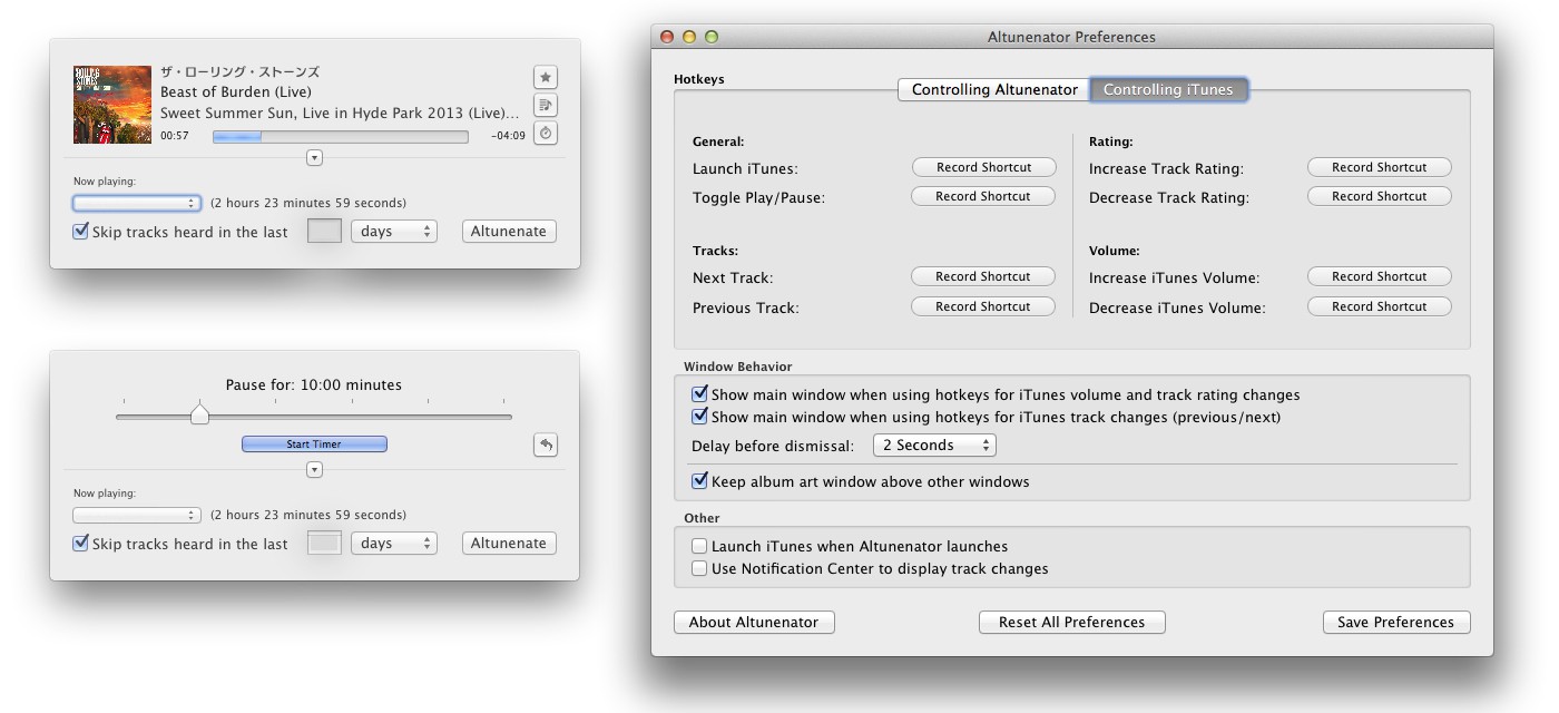 Altunenatorにはその他にもiTunesでの曲の再生を止めておく”Pause”機能やiTunes, Altunenatorのキーボードショートカット設定機能などもあります。