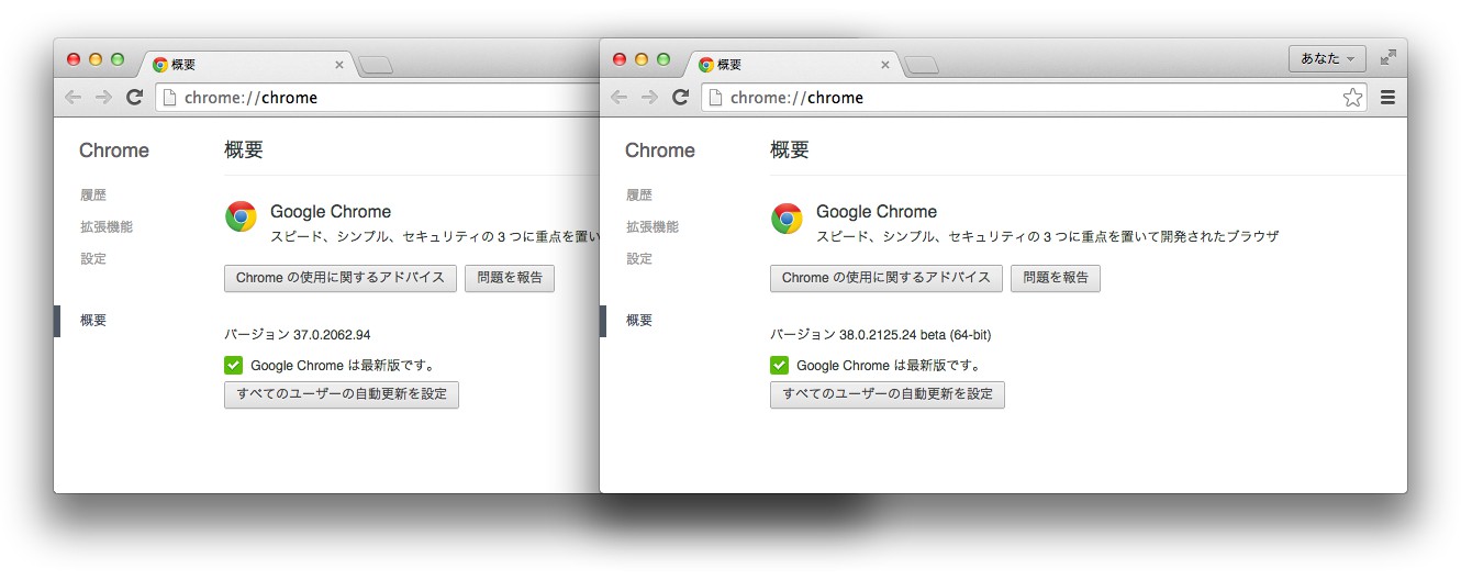 GoogleがGoogle Chromeのベータ版Chrome 38 for MacをBeta Channelに公開したとブログ(Mac Chrome: When I’m Sixty-Four (Bits)}で発表しています。