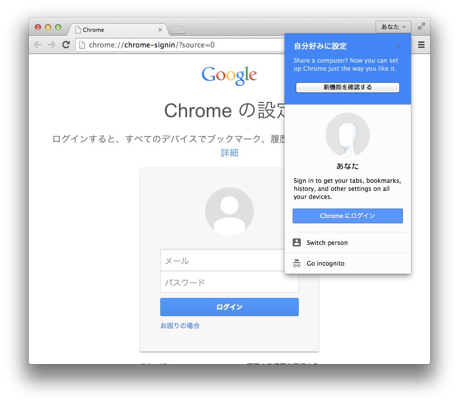 また、Chrome 38 for MacからiTunes 12の「Family Sharing」の様に、同じMacでChromeの設定を切り換えられる「People(Switch Person)」機能が搭載されるようです。