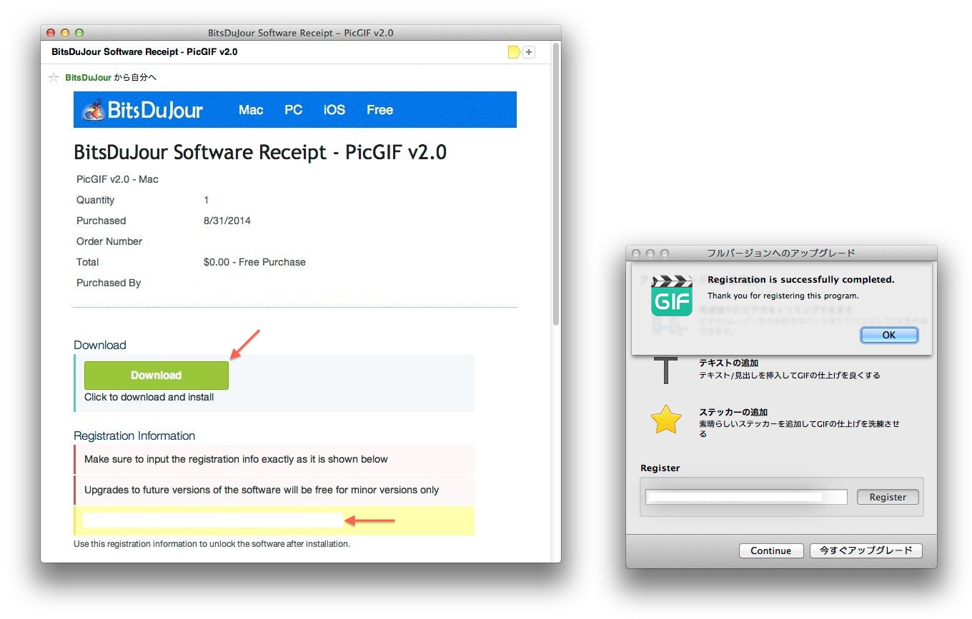 BitsDujourのキャンペーンサイトからダウンロードした方はPicGIF起動時に表示される「フルバージョンへのアップ」で表示されるウィンドウの[Register]にRegisterキーを入力してフルバージョンへアップグレードしてください。