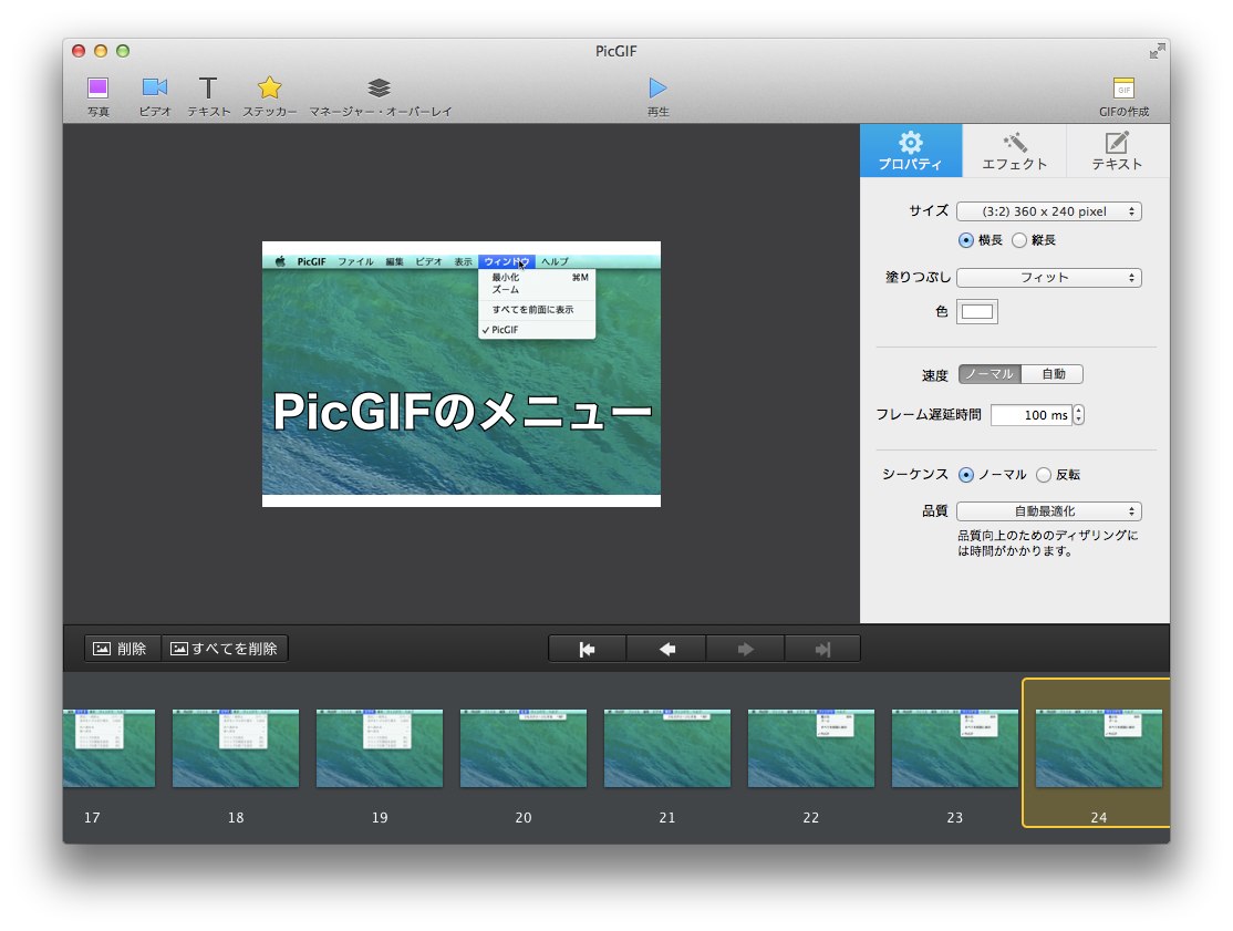PicGIFの使い方は公式サイトやYouTubeにチュートリアルが上がっていますが、PicGIFに動画ファイルや画像ファイルをドラッグ&ドロップするだけで自動的にサムネイルが作成され、右ウインドウの[プロパティ], [エフェクト], [テキスト]を入力して[GIFの作成]を押すだけでGIFアニメが作成されます。
