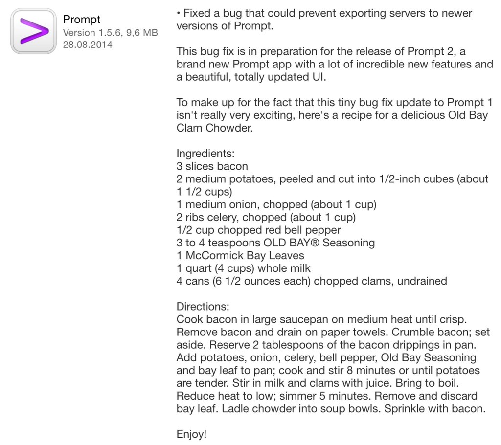 PanicがiOS用SSHクライアントアプリ「Prompt」のVersion 1.5.6アップデートで、「Prompt 2」への下準備となるアップデートを行いましたが、「この不具合修正はPrompt 1ユーザーにとって全くパッとしないものなので、ここで美味しいOld Bay クラムチャウダーのレシピを紹介します」としてレシピを掲載しています。