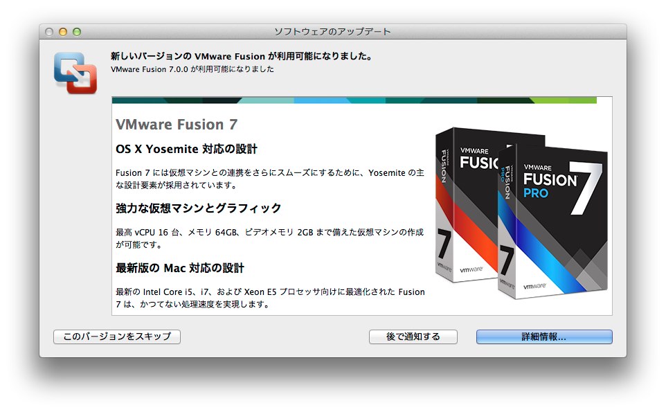 既にv6以前のVMware Fusion をインストールしてあるMacにはアップデート通知が来ていると思いますが、VMware Fusion 7の特徴は