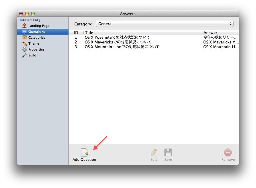 使い方は「Landing Page」と「Categories」を設定し、「Questions」項目の[Add Question]で質問のタイトルと回答を書き込んでいくだけです。