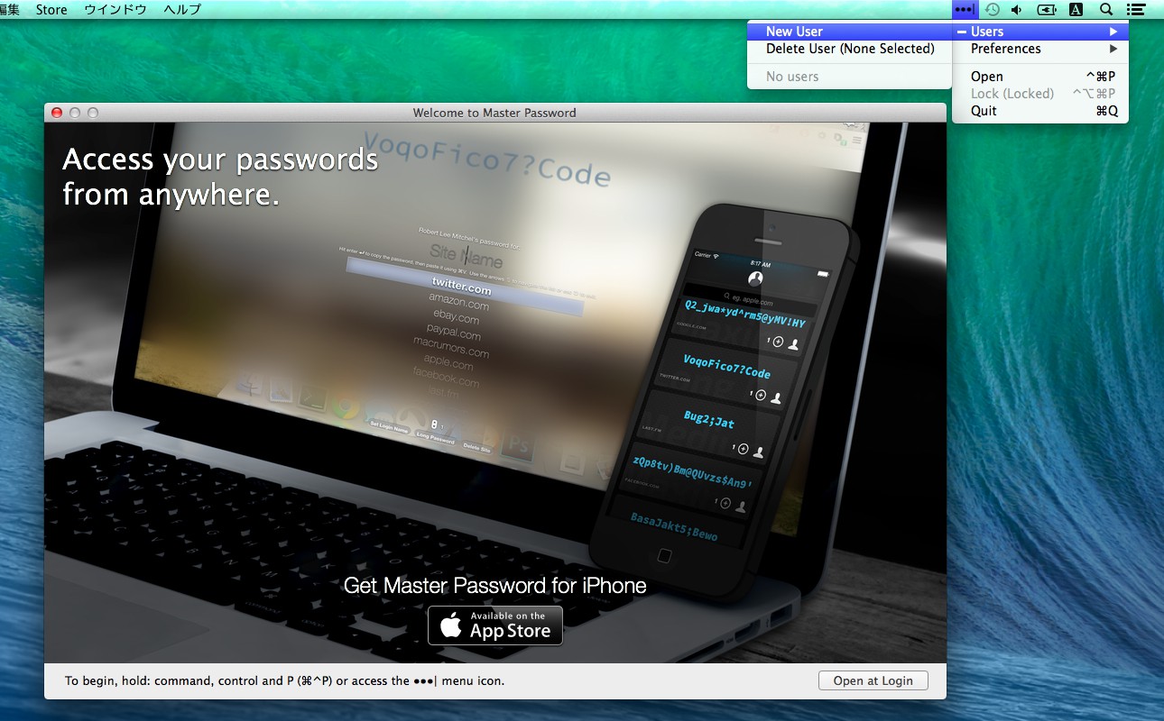 アプリを起動すると「Command + Control + PでMaster Passwordが起動しますという」Welcomeダイアログが出現しメニューバーにアイコンが現れるので、ここから[New User]を選択して新しくユーザーを設定します。